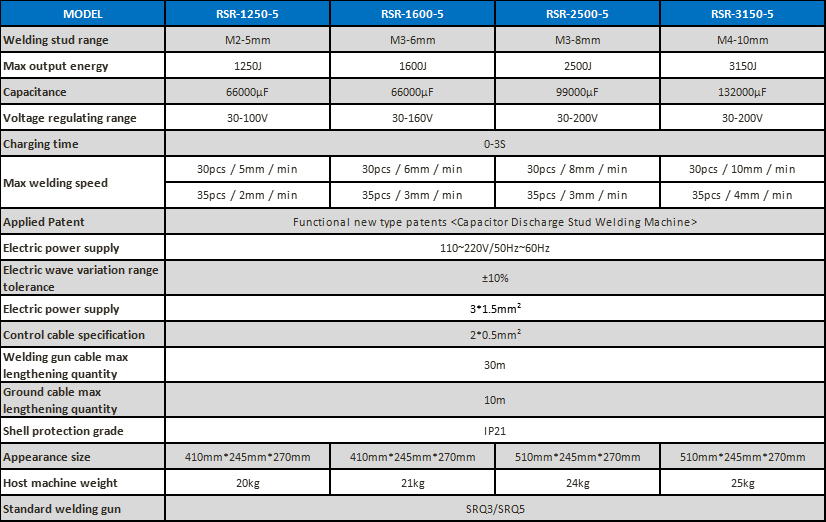 RSR series Capacitor Discharge Stud Welding Machine make the welding nails point discharge through the capacitor voltage, which can weld stud (diameter 2-10mm) and similar welding nails on the thin plate (thickness≥0.3mm).